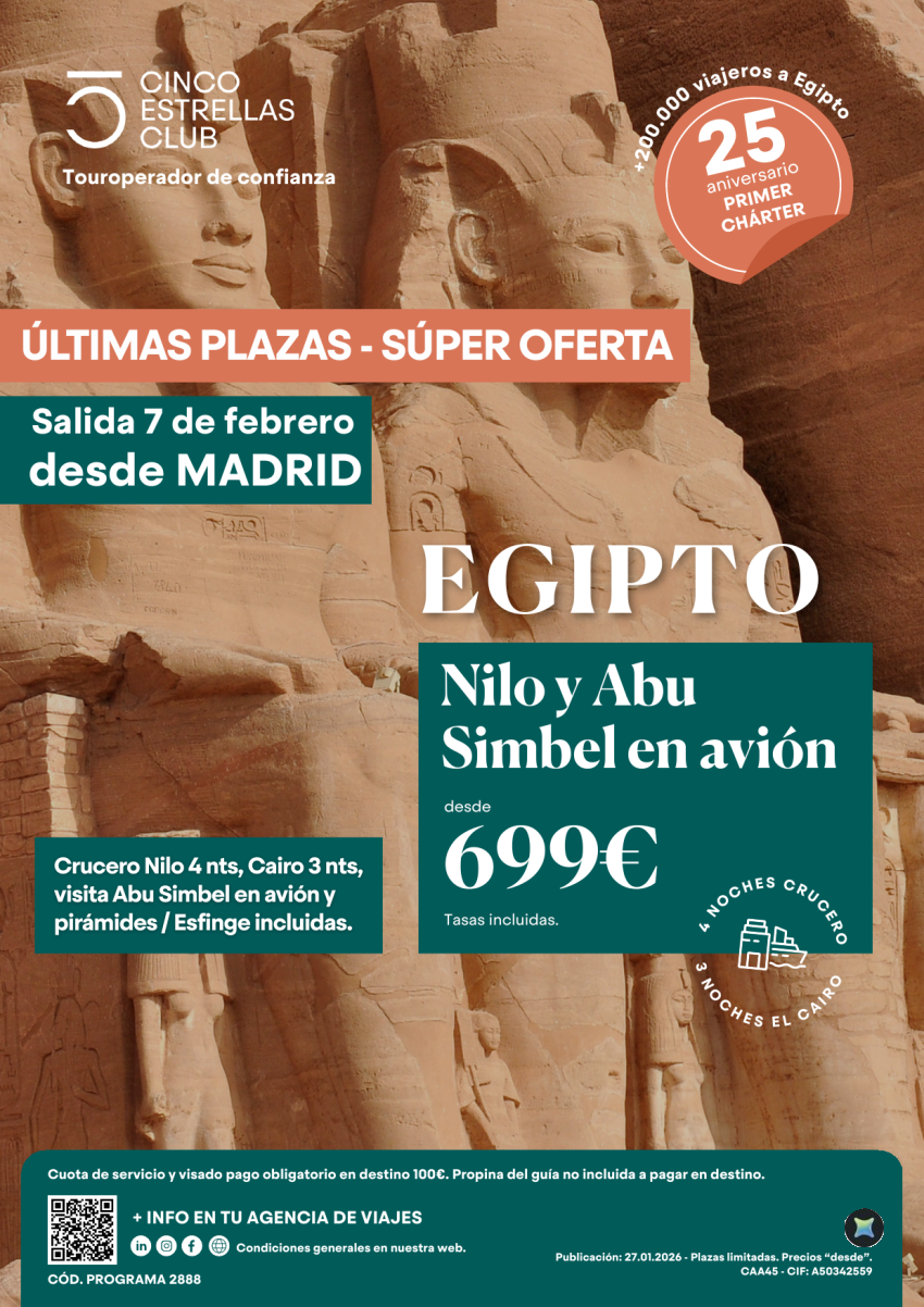 Súper Oferta Últimas Plazas Egipto Nilo y Abu Simbel en avión 8d/7ns 699€ sal. 07 Febrero desde Madrid