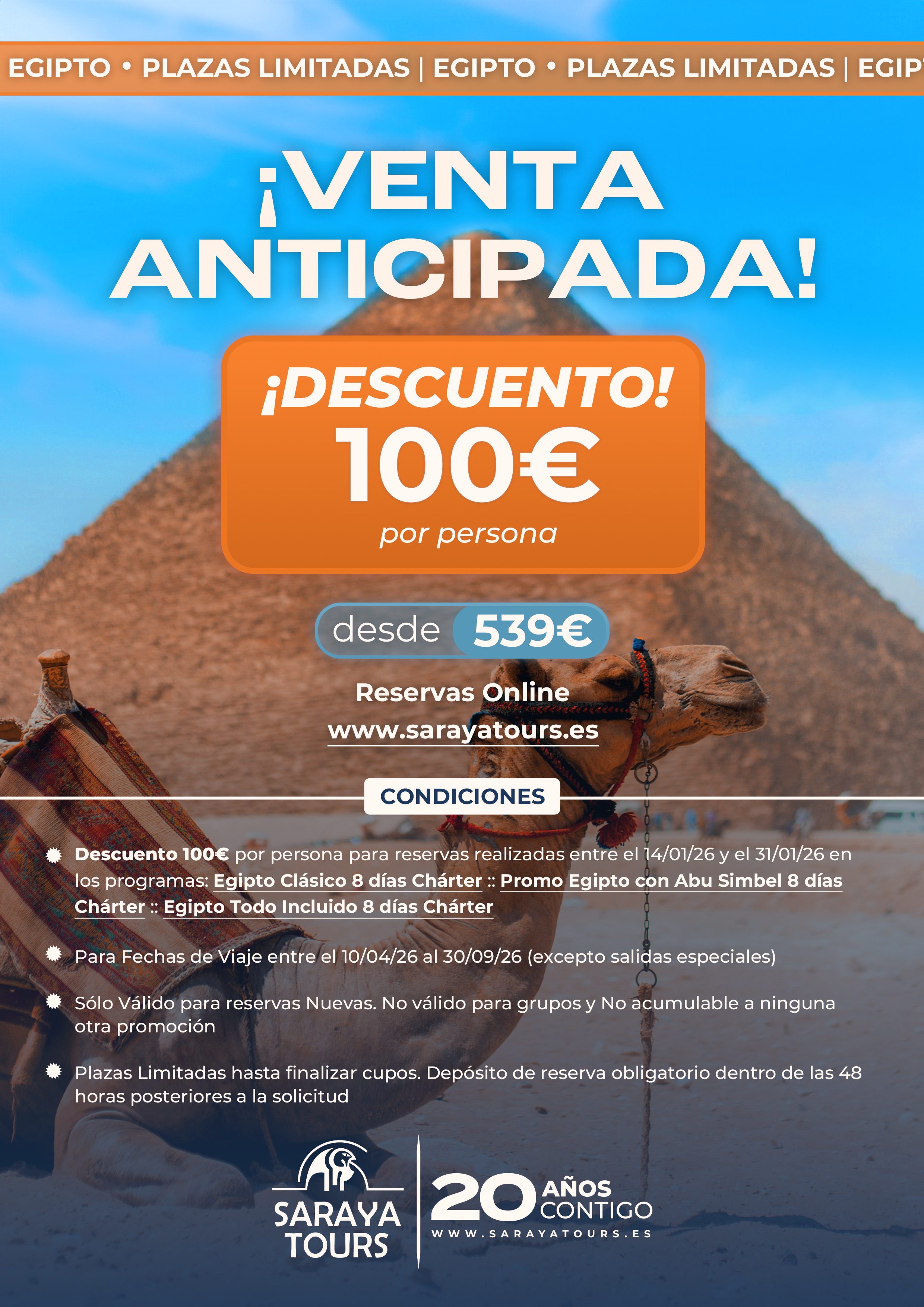 ¡¡ EGIPTO Venta Anticipada !! Descuento 100 € p.persona. Salidas 10/04/26 al 30/09/26. Consultar condiciones.